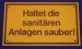 Hinweisschild ca.250x150x1,2mm aus altem Lagerbestand, u.U. leichte kleine Kratzer aber voll brauchbar. Größere Mengen auf Anfrage. Haltet d.sanitären Anlagen sauber!